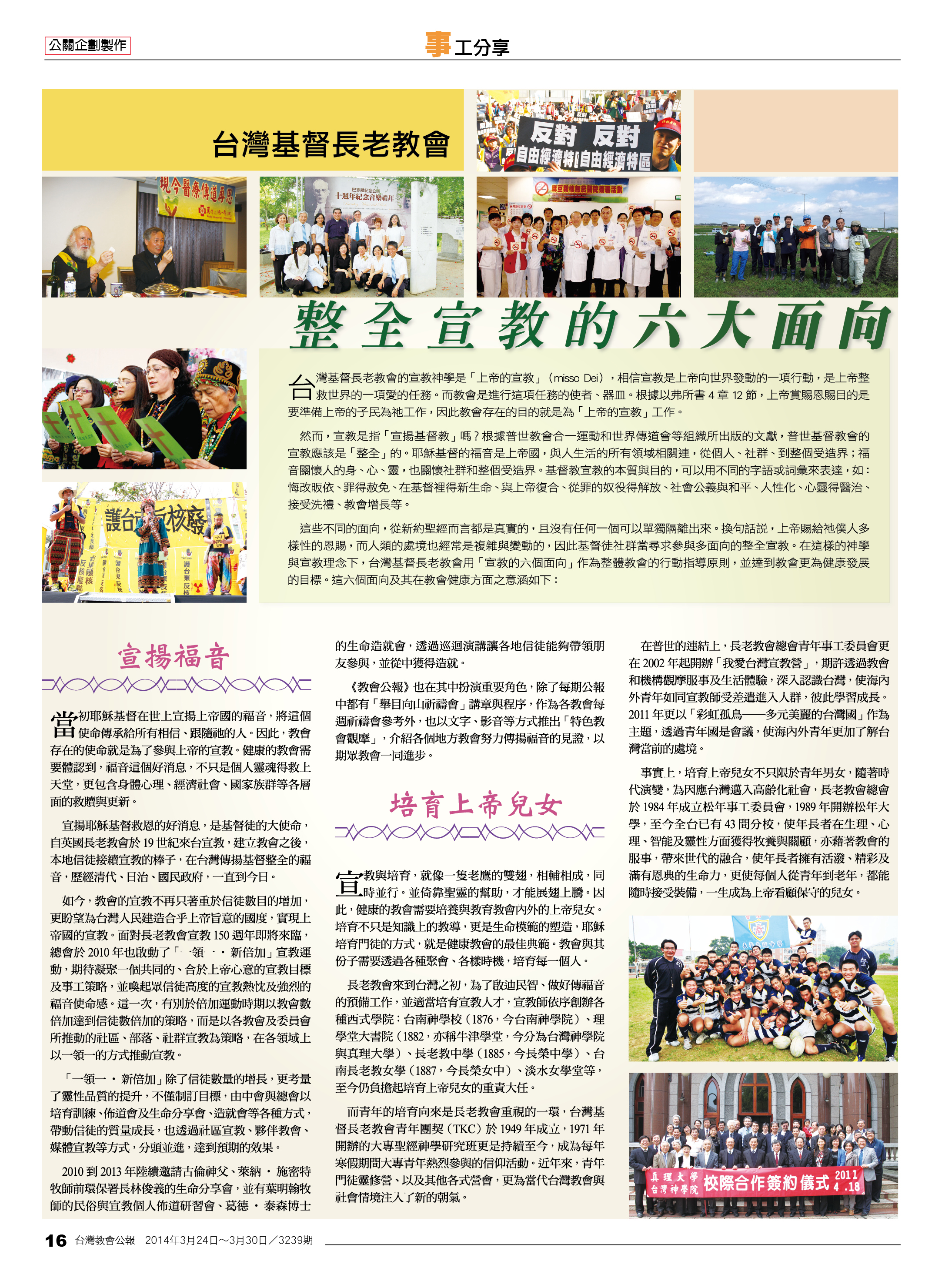 當初耶穌基督在世上宣揚上帝國的福音,將這個使命傳承給所有相信、跟隨祂的人。因此,教會存在的使命就是為了參與上帝的宣教。健康的教會需要體認到,福音這個好消息,不只是個人靈魂得救上天堂,更包含身體心理、經濟社會、國家族群等各層面的救贖與更新。 宣揚耶穌基督救恩的好消息,是基督徒的大使命,自英國長老教會於19世紀來台宣教,建立教會之後,本地信徒接續宣教的棒子,在台灣傳揚基督整全的福音,歷經清代、日治、國民政府,一直到今日。 如今,教會的宣教不再只著重於信徒數目的增加,更盼望為台灣人民建造合乎上帝旨意的國度,實現上帝國的宣教。面對長老教會宣教150週年即將來臨,總會於2010年也啟動了「一領一‧新倍加」宣教運動,期待凝聚一個共同的、合於上帝心意的宣教目標及事工策略,並喚起眾信徒高度的宣教熱忱及強烈的福音使命感。這一次,有別於倍加運動時期以教會數倍加達到信徒數倍加的策略,而是以各教會及委員會所推動的社區、部落、社群宣教為策略,在各領域上以一領一的方式推動宣教。 「一領一‧新倍加」除了信徒數量的增長,更考量了靈性品質的提升,不僅制訂目標,由中會與總會以培育訓練、佈道會及生命分享會、造就會等各種方式,帶動信徒的質量成長,也透過社區宣教、夥伴教會、媒體宣教等方式,分頭並進,達到預期的效果。 2010到2013年陸續邀請古倫神父、萊納‧施密特牧師前環保署長林俊義的生命分享會,並有葉明翰牧師的民俗與宣教個人佈道研習會、葛德‧泰森博士的生命造就會,透過巡迴演講讓各地信徒能夠帶領朋友參與,並從中獲得造就。 《教會公報》也在其中扮演重要角色,除了每期公報中都有「舉目向山祈禱會」講章與程序,作為各教會每週祈禱會參考外,也以文字、影音等方式推出「特色教會觀摩」,介紹各個地方教會努力傳揚福音的見證,以期眾教會一同進步。 〈二〉培育上帝兒女 宣教與培育,就像一隻老鷹的雙翅,相輔相成,同時並行。並倚靠聖靈的幫助,才能展翅上騰。因此,健康的教會需要培養與教育教會內外的上帝兒女。培育不只是知識上的教導,更是生命模範的塑造,耶穌培育門徒的方式,就是健康教會的最佳典範。教會與其份子需要透過各種聚會、各樣時機,培育每一個人。 長老教會來到台灣之初,為了啟迪民智、做好傳福音的預備工作,並適當培育宣教人才,宣教師依序創辦各種西式學院:台南神學校(1876,今台南神學院)、理學堂大書院(1882,亦稱牛津學堂,今分為台灣神學院與真理大學)、長老教中學(1885,今長榮中學)、台南長老教女學(1887,今長榮女中)、淡水女學堂等,至今仍負擔起培育上帝兒女的重責大任。 而青年的培育向來是長老教會重視的一環,台灣基督長老教會青年團契(TKC)於1949年成立,1971年開辦的大專聖經神學研究班更是持續至今,成為每年寒假期間大專青年熱烈參與的信仰活動。近年來,青年門徒靈修營、以及其他各式營會,更為當代台灣教會與社會情境注入了新的朝氣。 在普世的連結上,長老教會總會青年事工委員會更在2002年起開辦「我愛台灣宣教營」,期許透過教會和機構觀摩服事及生活體驗,深入認識台灣,使海內外青年如同宣教師受差遣進入人群,彼此學習成長。2011年更以「彩虹孤鳥──多元美麗的台灣國」作為主題,透過青年國是會議,使海內外青年更加了解台灣當前的處境。 事實上,培育上帝兒女不只限於青年男女,隨著時代演變,為因應台灣邁入高齡化社會,長老教會總會於1984年成立松年事工委員會,1989年開辦松年大學,至今全台已有43間分校,使年長者在生理、心理、智能及靈性方面獲得牧養與關顧,亦藉著教會的服事,帶來世代的融合,使年長者擁有活潑、精彩及滿有恩典的生命力,更使每個人從青年到老年,都能隨時接受裝備,一生成為上帝看顧保守的兒女。 〈三〉愛心服事 愛是基督信仰的最大誡命,服事是耶穌一生所做的事,教會成為基督的身體,實踐愛心服事是理所當然的。不論是對教會內部的信徒,或是對社會世界的非信徒,關懷弱勢、幫助缺乏者、用愛撫平仇恨與隔閡等,都是健康教會需要倡導、推動、並實踐的愛心服事。 台灣基督長老教會在台灣的宣教,是從為人們醫病開始,幫助人在身體上得到健康,進一步體會上帝的愛。台灣第一間西式現代化醫院是由英國蘇格蘭長老教會馬雅各博士於1865年創設「看西街醫館」開始,到了1900年以後稱為「新樓醫院」;北部的馬偕博士則於1880年創立「偕醫館」,他除了為病患診治各種疾病,也常「一手聖經一手鉗」,帶領門徒四處醫療傳道,足跡遍行北台灣,今日的馬偕紀念醫院,遍及台北、淡水、新竹、台東,並分設馬偕護專、馬偕醫學院,結合醫療與教育,持續服務台灣人民;中部則有梅鑑霧牧師及蘭大衛醫師於1896年設立的「彰化醫館」,也是就今日的彰化基督教醫院,在100多年的耕耘下,於中部有10個院區,並有山區、海外醫療團持續從事醫療宣教工作。 除了教會醫院,長老教會也針對社會各種弱勢族群提供援助,在總會的平安基金會下轄8個社福機構,分別從事失聰弱勢身心障礙者服務(身心障礙關懷中心)、心智障礙者成人社區照顧服務(澎湖老人日照、家暴服務中心)、身心障礙者教養暨輔具服務(高雄市身心障礙福利服務中心)、弱勢海員漁民暨漁村社區照顧服務(海員/漁民服務中心)、弱勢原住民照