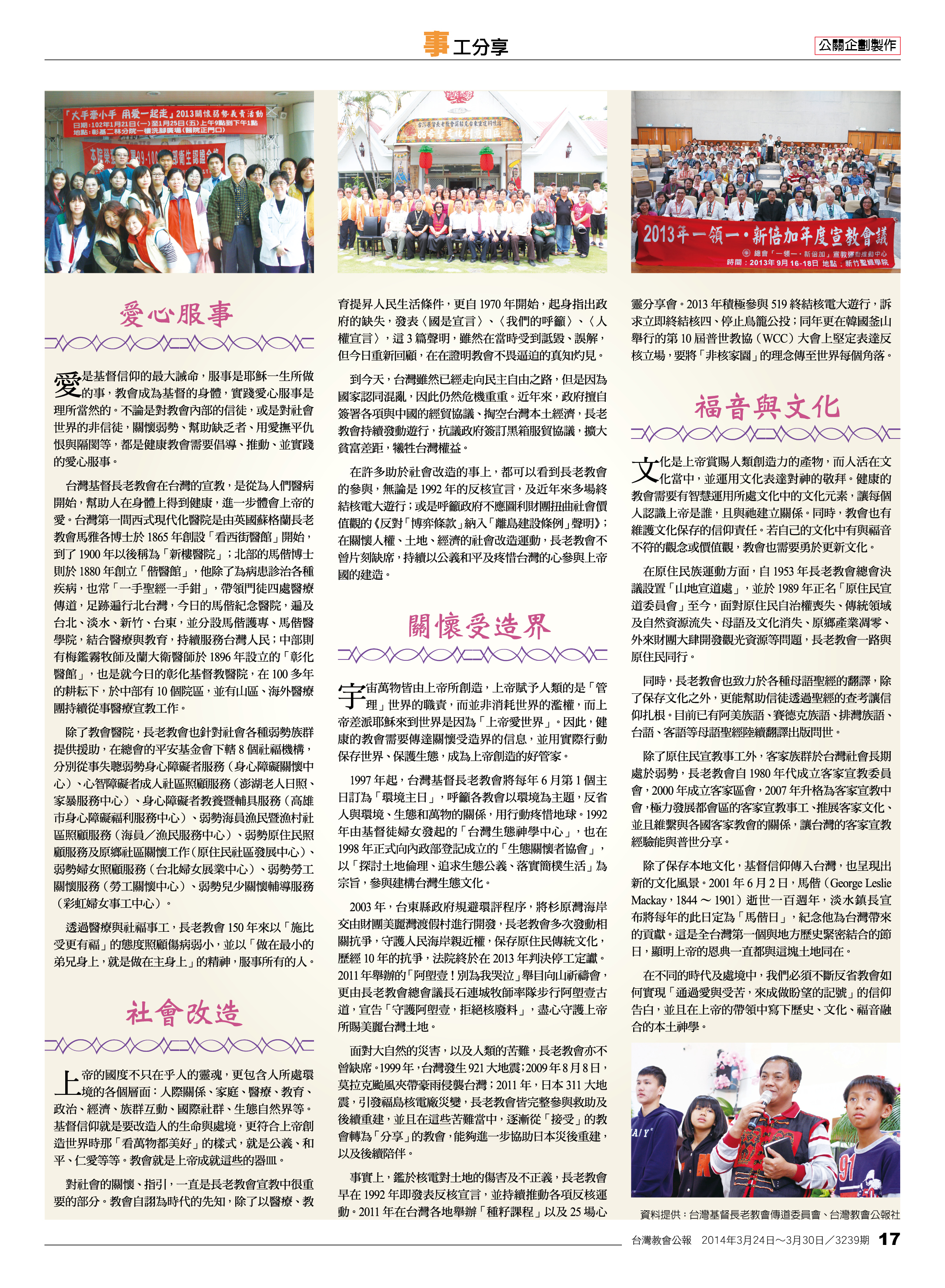 宇宙萬物皆由上帝所創造,上帝賦予人類的是「管理」世界的職責,而並非消耗世界的濫權,而上帝差派耶穌來到世界是因為「上帝愛世界」。因此,健康的教會需要傳達關懷受造界的信息,並用實際行動保存世界、保護生態,成為上帝創造的好管家。 1997年起,台灣基督長老教會將每年6月第1個主日訂為「環境主日」,呼籲各教會以環境為主題,反省人與環境、生態和萬物的關係,用行動疼惜地球。1992年由基督徒婦女發起的「台灣生態神學中心」,也在1998年正式向內政部登記成立的「生態關懷者協會」,以「探討土地倫理、追求生態公義、落實簡樸生活」為宗旨,參與建構台灣生態文化。 2003年,台東縣政府規避環評程序,將杉原灣海岸交由財團美麗灣渡假村進行開發,長老教會多次發動相關抗爭,守護人民海岸親近權,保存原住民傳統文化,歷經10年的抗爭,法院終於在2013年判決停工定讞。2011年舉辦的「阿塱壹!別為我哭泣」舉目向山祈禱會,更由長老教會總會議長石連城牧師率隊步行阿塱壹古道,宣告「守護阿塱壹,拒絕核廢料」,盡心守護上帝所賜美麗台灣土地。 面對大自然的災害,以及人類的苦難,長老教會亦不曾缺席。1999年,台灣發生921大地震;2009年8月8日,莫拉克颱風夾帶豪雨侵襲台灣;2011年,日本311大地震,引發福島核電廠災變,長老教會皆完整參與救助及後續重建,並且在這些苦難當中,逐漸從「接受」的教會轉為「分享」的教會,能夠進一步協助日本災後重建,以及後續陪伴。 事實上,鑑於核電對土地的傷害及不正義,長老教會早在1992年即發表反核宣言,並持續推動各項反核運動。2011年在台灣各地舉辦「種籽課程」以及25場心靈分享會。2013年積極參與519終結核電大遊行,訴求立即終結核四、停止鳥籠公投;同年更在韓國釜山舉行的第10屆普世教協(WCC)大會上堅定表達反核立場,要將「非核家園」的理念傳至世界每個角落。 (六)福音與文化 文化是上帝賞賜人類創造力的產物,而人活在文化當中,並運用文化表達對神的敬拜。健康的教會需要有智慧運用所處文化中的文化元素,讓每個人認識上帝是誰,且與祂建立關係。同時,教會也有維護文化保存的信仰責任。若自己的文化中有與福音不符的觀念或價值觀,教會也需要勇於更新文化。 在原住民族運動方面,自1953年長老教會總會決議設置「山地宣道處」,並於1989年正名「原住民宣道委員會」至今,面對原住民自治權喪失、傳統領域及自然資源流失、母語及文化消失、原鄉產業凋零、外來財團大肆開發觀光資源等問題,長老教會一路與原住民同行。 同時,長老教會也致力於各種母語聖經的翻譯,除了保存文化之外,更能幫助信徒透過聖經的查考讓信仰扎根。目前已有阿美族語、賽德克族語、排灣族語、台語、客語等母語聖經陸續翻譯出版問世。 除了原住民宣教事工外,客家族群於台灣社會長期處於弱勢,長老教會自1980年代成立客家宣教委員會,2000年成立客家區會,2007年升格為客家宣教中會,極力發展都會區的客家宣教事工、推展客家文化、並且維繫與各國客家教會的關係,讓台灣的客家宣教經驗能與普世分享。 除了保存本地文化,基督信仰傳入台灣,也呈現出新的文化風景。2001年6月2日,馬偕(George Leslie Mackay,1844~1901)逝世一百週年,淡水鎮長宣布將每年的此日定為「馬偕日」,紀念他為台灣帶來的貢獻。這是全台灣第一個與地方歷史緊密結合的節日,顯明上帝的恩典一直都與這塊土地同在。 在不同的時代及處境中,我們必須不斷反省教會如何實現「通過愛與受苦,來成做盼望的記號」的信仰告白,並且在上帝的帶領中寫下歷史、文化、福音融合的本土神學。 資料提供:台灣基督長老教會傳道委員會、台灣教會公報社 |